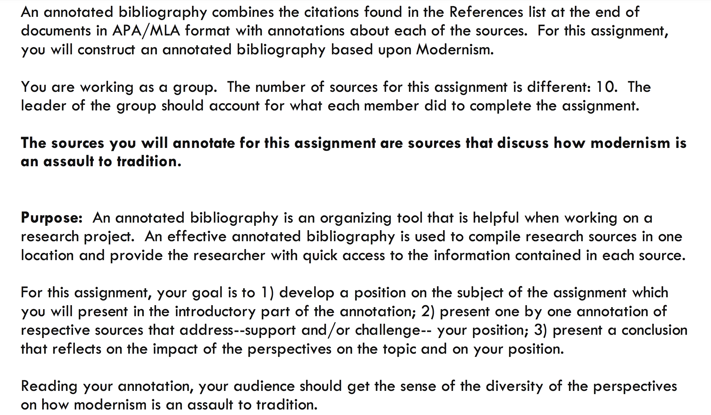 The number of sources for this assignment is different: 10. The leader of the group should account for what each member did to complete the assignment. The sources you will annotate for this assignment are sources that discuss how modernism is an assault to tradition. Purpose: An annotated bibliography is an organizing tool that is helpful when working on a research project. An effective annotated bibliography is used to compile research sources in one location and provide the researcher with quick access to the information contained in each source.