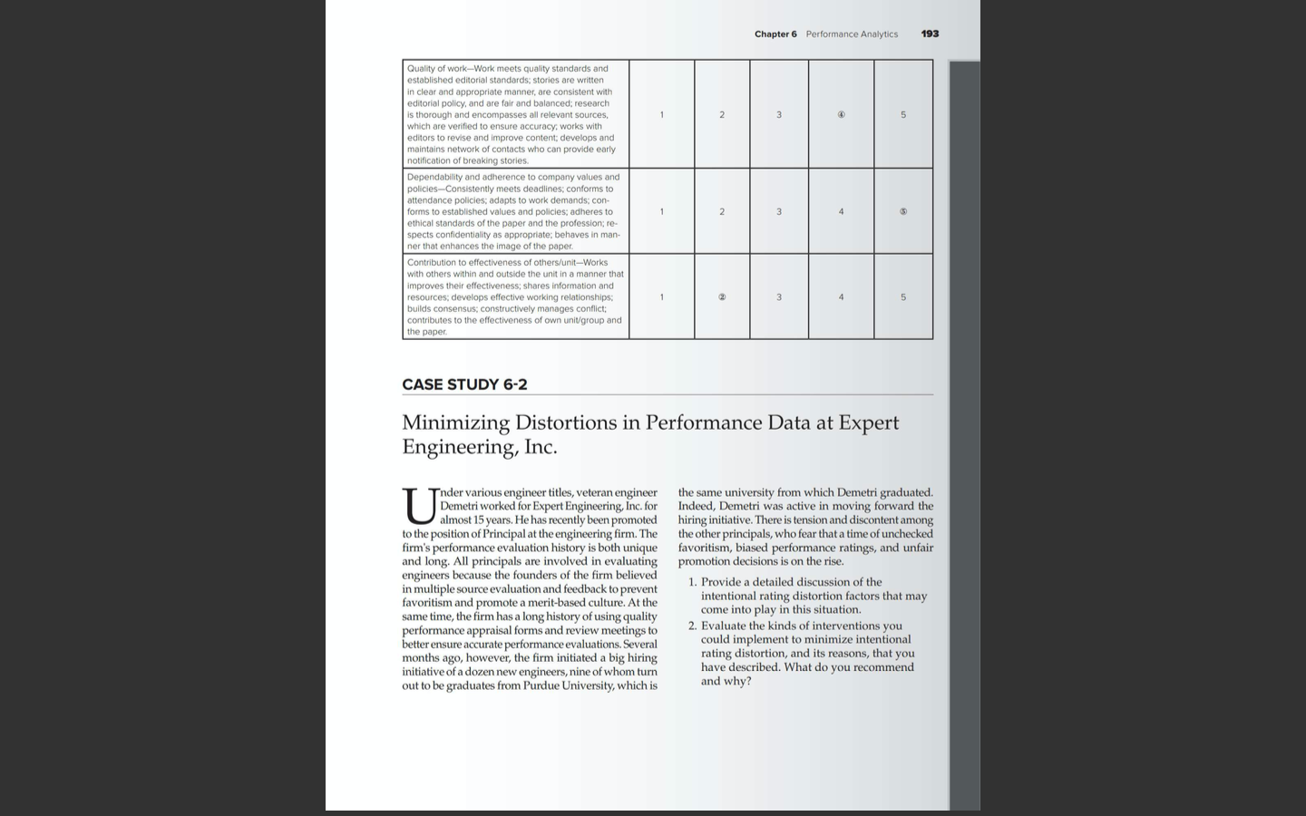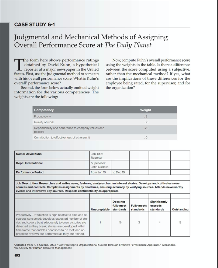 Module 07: There are a variety of factors that can affect the overall performance rating of an individual. Aguinis (2019) defined two methods—judgmental and mechanical—for reaching an overall score, and states that the mechanical approach is preferable in most cases, particularly if performance objectives are not weighted. Review “Case Study 6-1: Judgmental and Mechanical Methods of Assigning Overall Performance Score at The Daily Planet” at the end of Chapter 6 in the Performance Management textbook. • First use the judgmental method to come up with Kuhn’s overall performance score. • Next, compute Kuhn’s overall performance score using the weights in the table. Is there a difference in the scores? What are the implications for the employee rated, for the supervisor, and for the organization? Which method would you use and why?