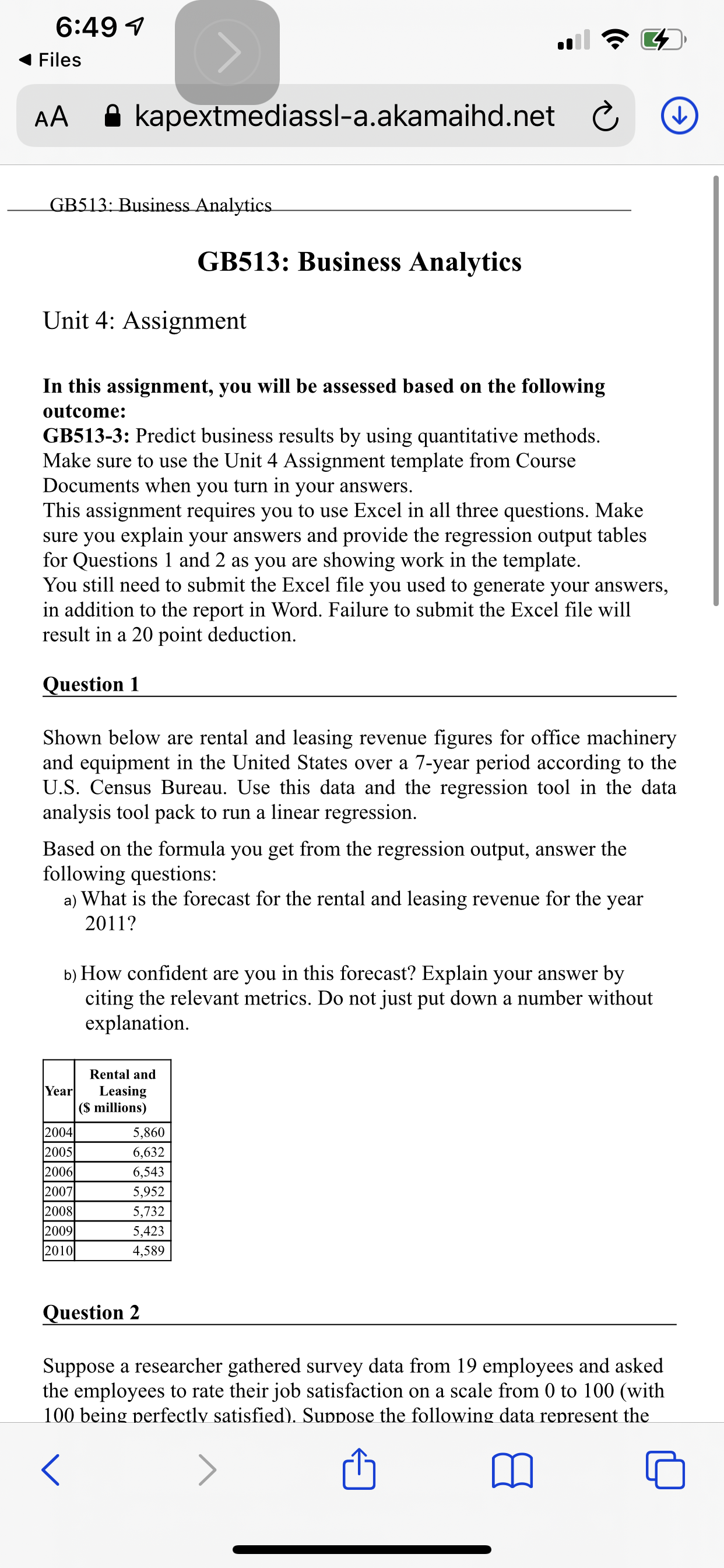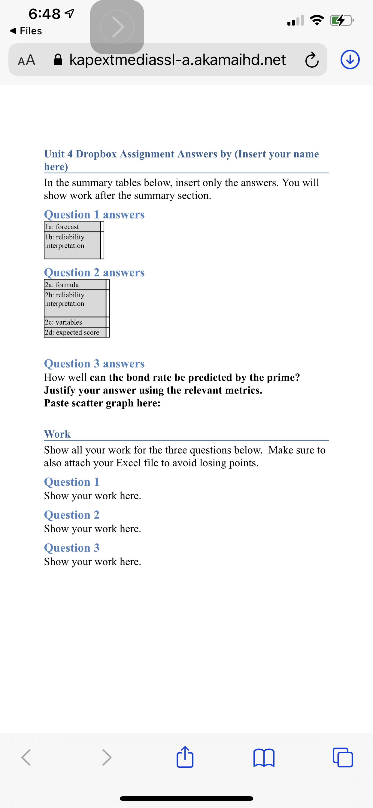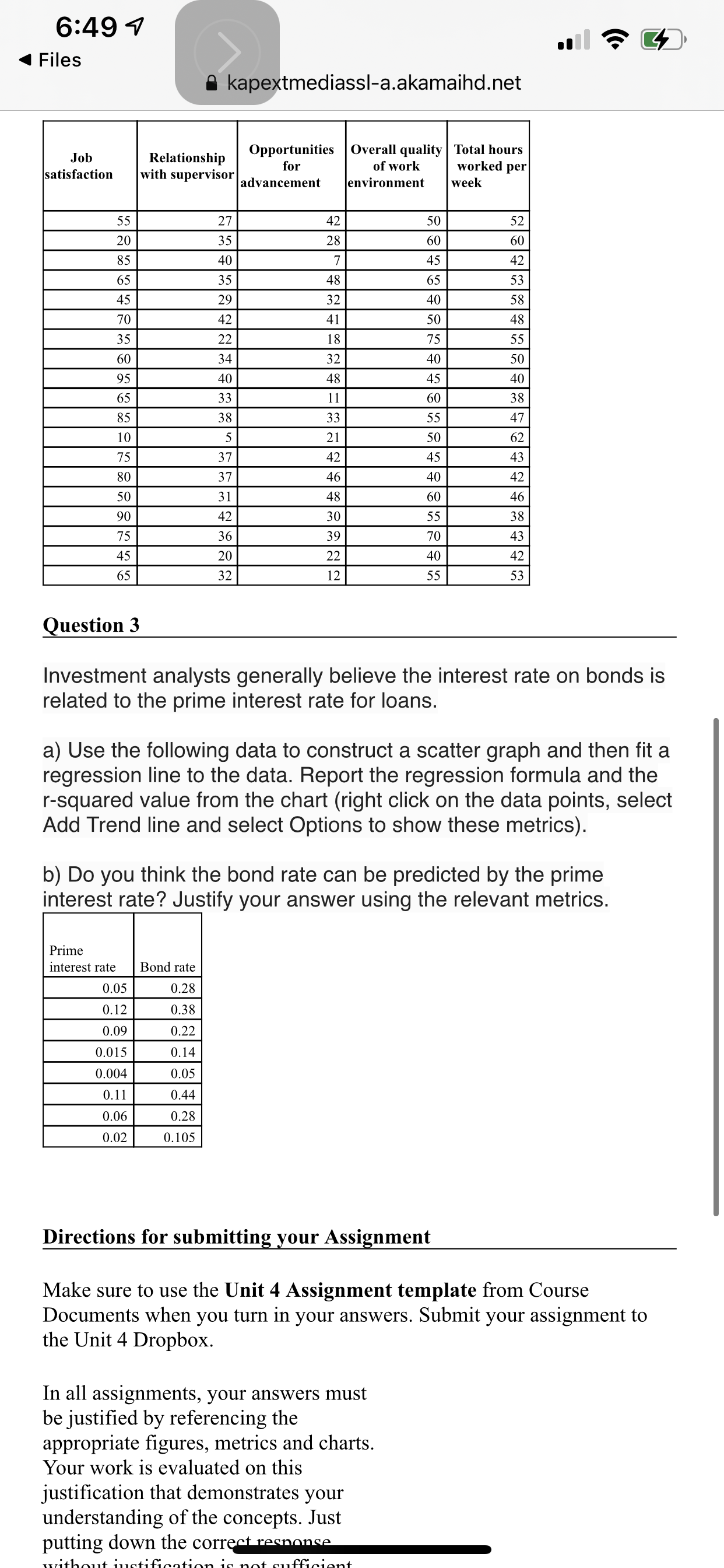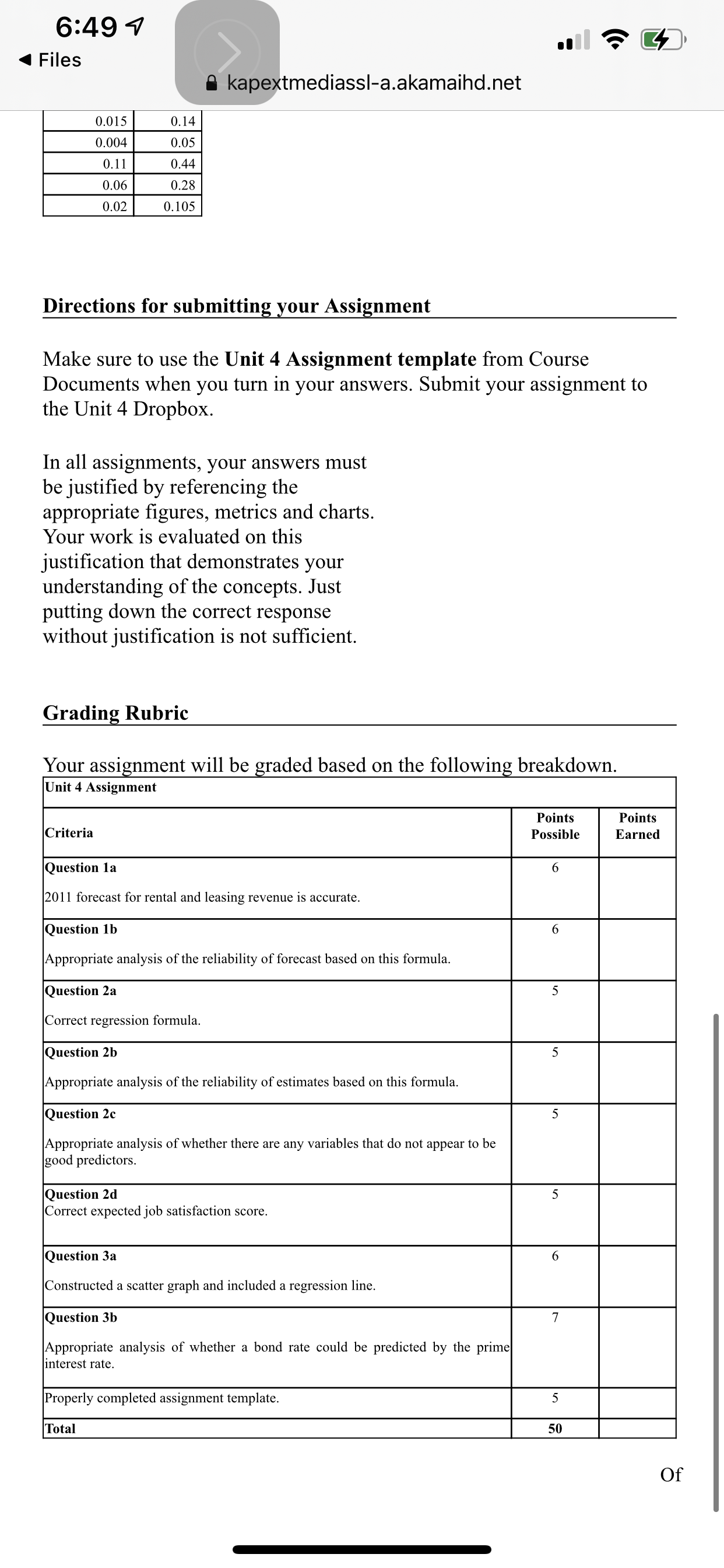 Unit 4 Assignment Make sure to use the Unit 4 Assignment template from Course Documents when you turn in your answers. Submit your assignment to the Unit 4 Dropbox. In all assignments, your answers must be justified by referencing the appropriate figures, metrics and charts. Your work is evaluated on this justification that demonstrates your understanding of the concepts. Just putting down the correct response without justification is not sufficient.
