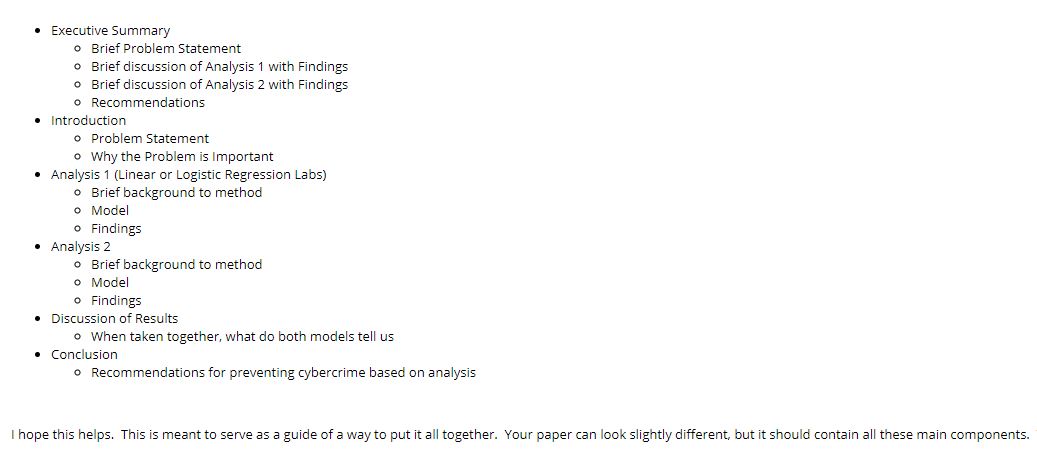 • we were just given this outline: +Executive Summary -Brief Problem Statement -Brief discussion of Analysis 1 with Findings -Brief discussion of Analysis 2 with Findings -Recommendations +Introduction -Problem Statement -Why the Problem is Important +Analysis 1 (Linear or Logistic Regression Labs) -Brief background to method -Model -Findings +Analysis 2 -Brief background to method -Model -Findings +Discussion of Results -When taken together, what do both models tell us +Conclusion -Recommendations for preventing cybercrime based on analysis