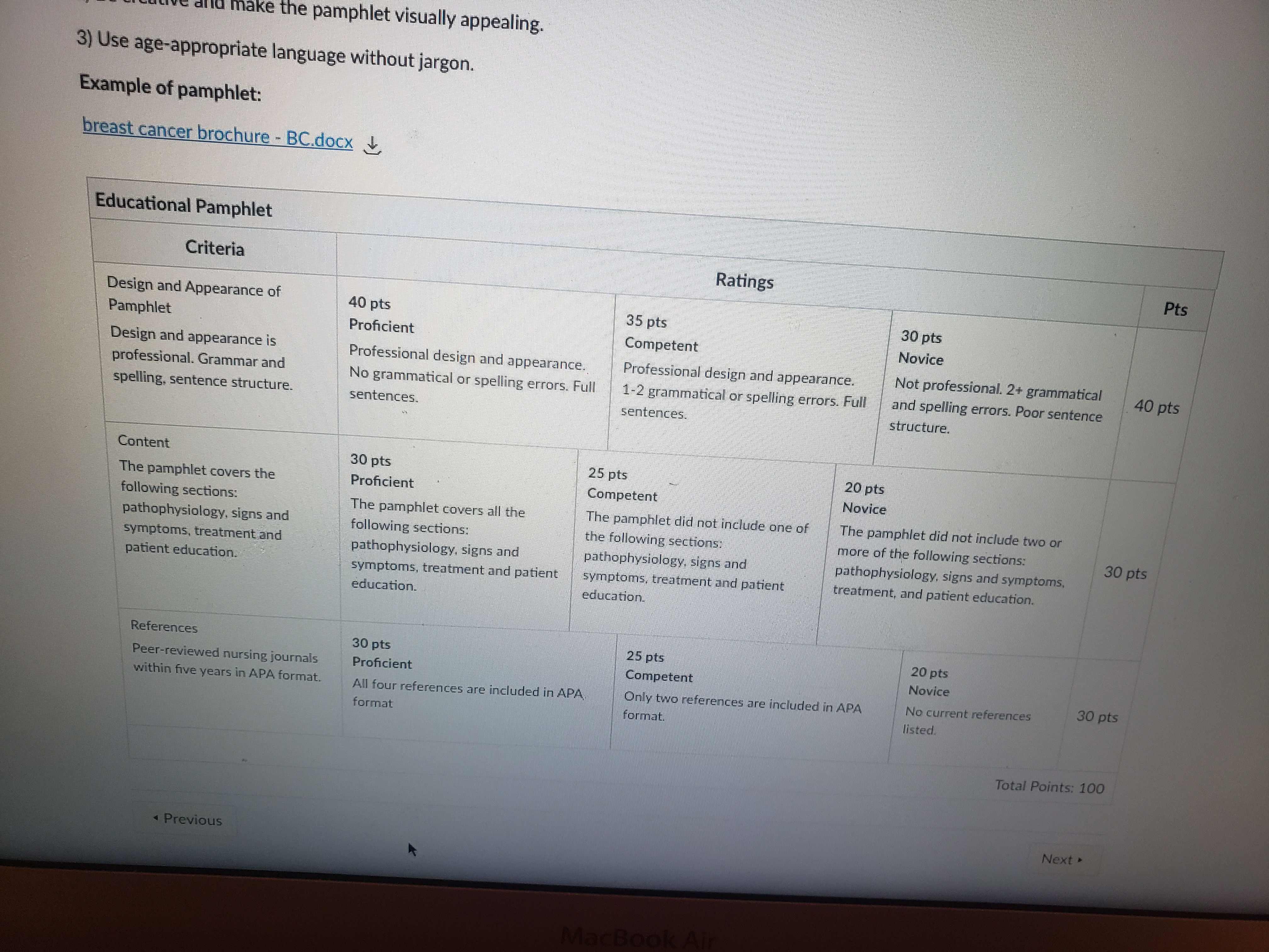 Create an educational pamphlet for your presentation. Be creative. Keep in mind the level of the reader when writing this pamphlet. Most often, when designing a pamphlet, readability should be at the 7th-8th grade level. Use the same references for when you wrote your teaching topic in Week 2. You may use additional resources for your pamphlet, but make sure these are professional websites (i.e. . gov, .org ) Include the following sections in your pamphlet: description of topic, pathophysiology, signs and symptoms, treatment, and patient education. Things to keep in mind when putting together your pamphlet: 1) Know your audience 2) Be creative and make the pamphlet visually appealing. 3) Use age-appropriate language without jargon.