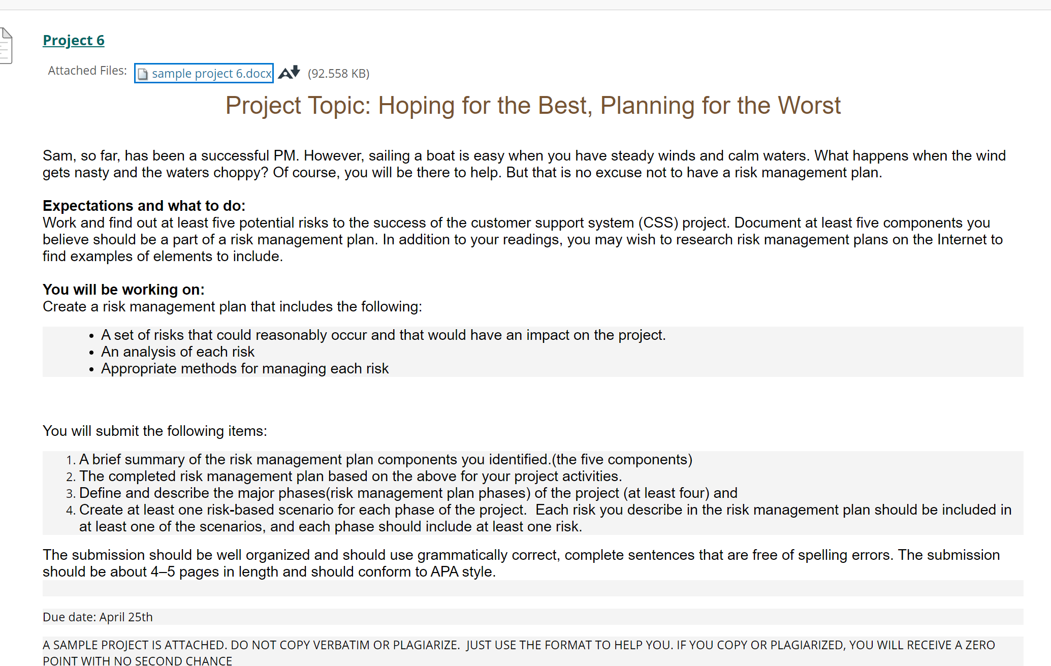 InstructionSam, so far, has been a successful PM. However, sailing a boat is easy when you have steady winds and calm waters. What happens when the wind gets nasty and the waters choppy? Of course, you will be there to help. But that is no excuse not to have a risk management plan. Expectations and what to do: Work and find out at least five potential risks to the success of the customer support system (CSS) project. Document at least five components you believe should be a part of a risk management plan. In addition to your readings, you may wish to research risk management plans on the Internet to find examples of elements to include. You will be working on: Create a risk management plan that includes the following: A set of risks that could reasonably occur and that would have an impact on the project. An analysis of each risk Appropriate methods for managing each risk You will submit the following items: A brief summary of the risk management plan components you identified.(the five components) The completed risk management plan based on the above for your project activities. Define and describe the major phases(risk management plan phases) of the project (at least four) and Create at least one risk-based scenario for each phase of the project. Each risk you describe in the risk management plan should be included in at least one of the scenarios, and each phase should include at least one risk. The submission should be well organized and should use grammatically correct, complete sentences that are free of spelling errors. The submission should be about 4–5 pages in length and should conform to APA style.