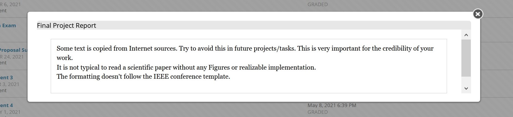 • THIS IS THE COMMENT FROM THE INSTRUCTOR Some text is copied from Internet sources. Try to avoid this in future projects/tasks. This is very important for the credibility of your work. It is not typical to read a scientific paper without any Figures or realizable implementation. The formatting doesn't follow the IEEE conference template.