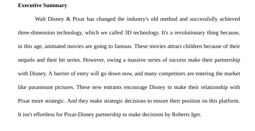 • All of this should be one paragraph but capture the essence of your analysis. All in proper APA format and style. So your format would be: APA Cover page Introduction to the assignment – i.e. what you are changing The Original ES from your paper. The Your Revised ES Conclusion – telling what you revised and why. Your assignment this week is revise your Pixar Executive Summary to be clear, concise, and focused. Using the writing techniques you have learned so far, try your hand at revising your Pixar executive summary. Please review the Grading Rubric Prior to submission. Submit to the drop box below no later than Sunday of this week.