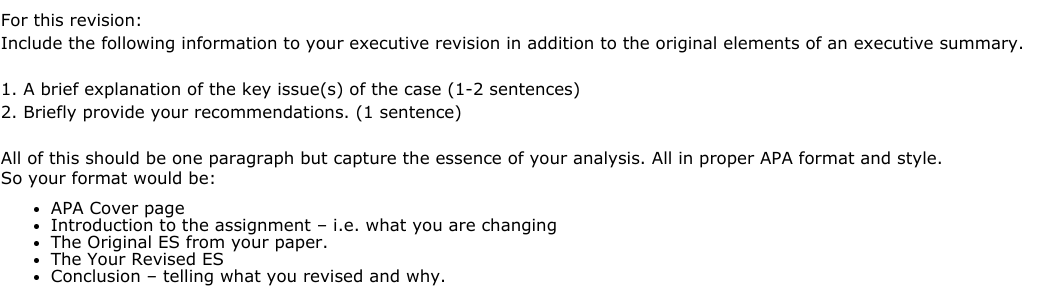 • Hi yes you always get 10/10 All of this should be one paragraph but capture the essence of your analysis. All in proper APA format and style. So your format would be: APA Cover page ****Introduction to the assignment – i.e. what you are changing**** The Original ES from your paper. The Your Revised ES Conclusion – telling what you revised and why. ***= missing (just 1 item)