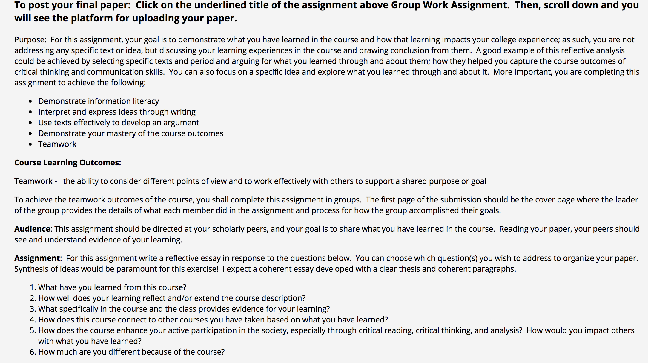 You should have at least four (4) different sources; only one of these sources should be a website; the rest should be a combination of text from the assigned readings. Word Limit/Length: 750-1000 No more than 4 pages excluding the reference/work-cited page How You Will Be Graded: Please, see the essay rubric in the course. Content/Subject: Begin with an introduction where you identify the scope of your reflection. Cite and analyze sources and use specific evidence from what we did in the class to illustrate your learning; do not quote a passage without showing the relevance of the quotation; and avoid quoting long passages without justification. Organize each paragraph around specific topic that develops the main idea. Create a reference/work-cited page. A statement/presentation of evidence of teamwork: how each member participated to achieve the goal.