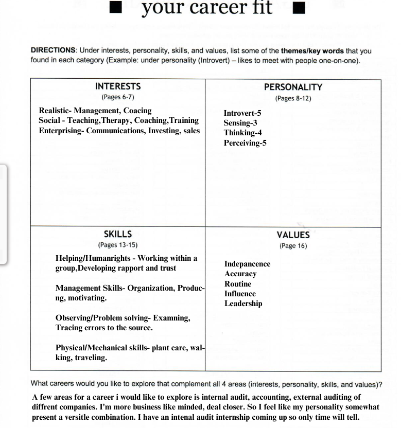Write a 3 page paper reflecting on your self-assessments. Compare your Career Leader assessment to your written assessments*. Include what you consider to be your most significant factors in your career decision-making. What interests, skills, values, personality characteristics or lifestyle priorities surfaced through these assessments? Were there surprises in your assessment results? Did your assessments confirm any factors which you knew to be important to you?