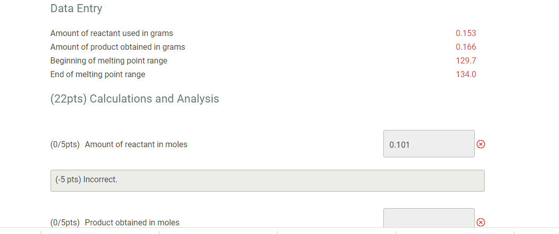 • hello, i submitted your numbers and they are all wrong, can you please correct it and check what you did wrong i still have 1 attempts remaining. , so these numbers are wrong Amount of reactant in moles, Product obtained in moles, Product theoretical yield, Product percent yield