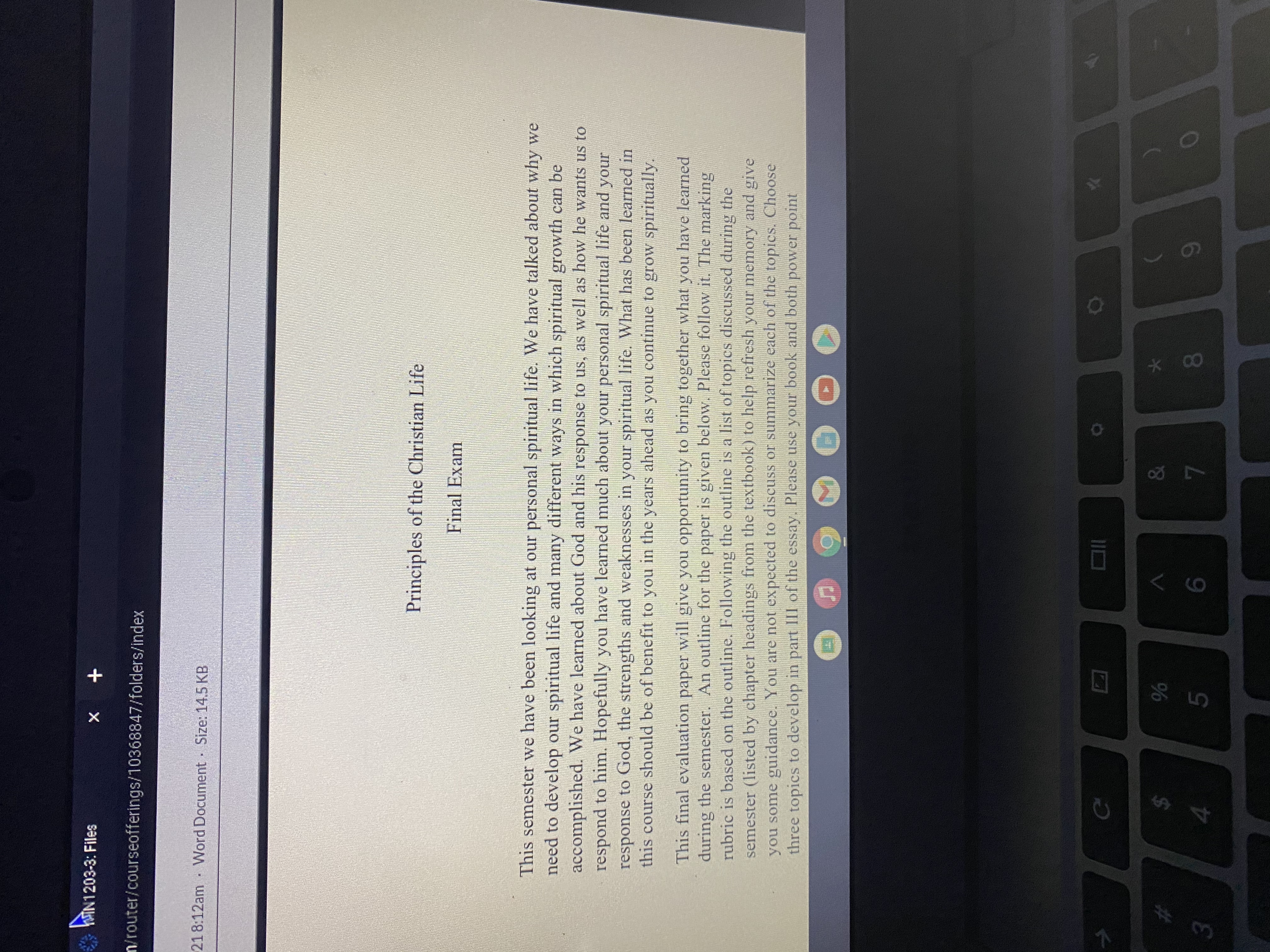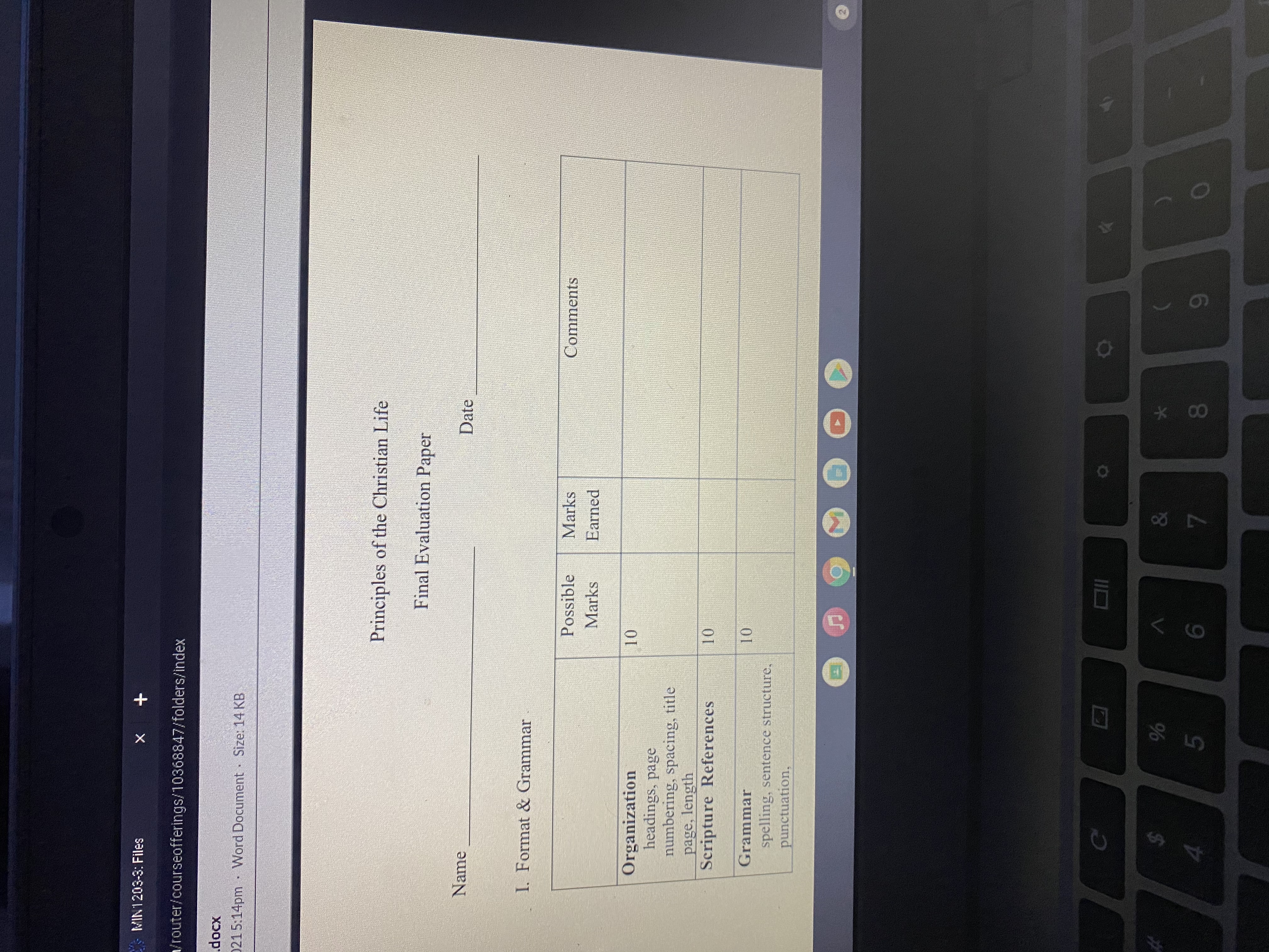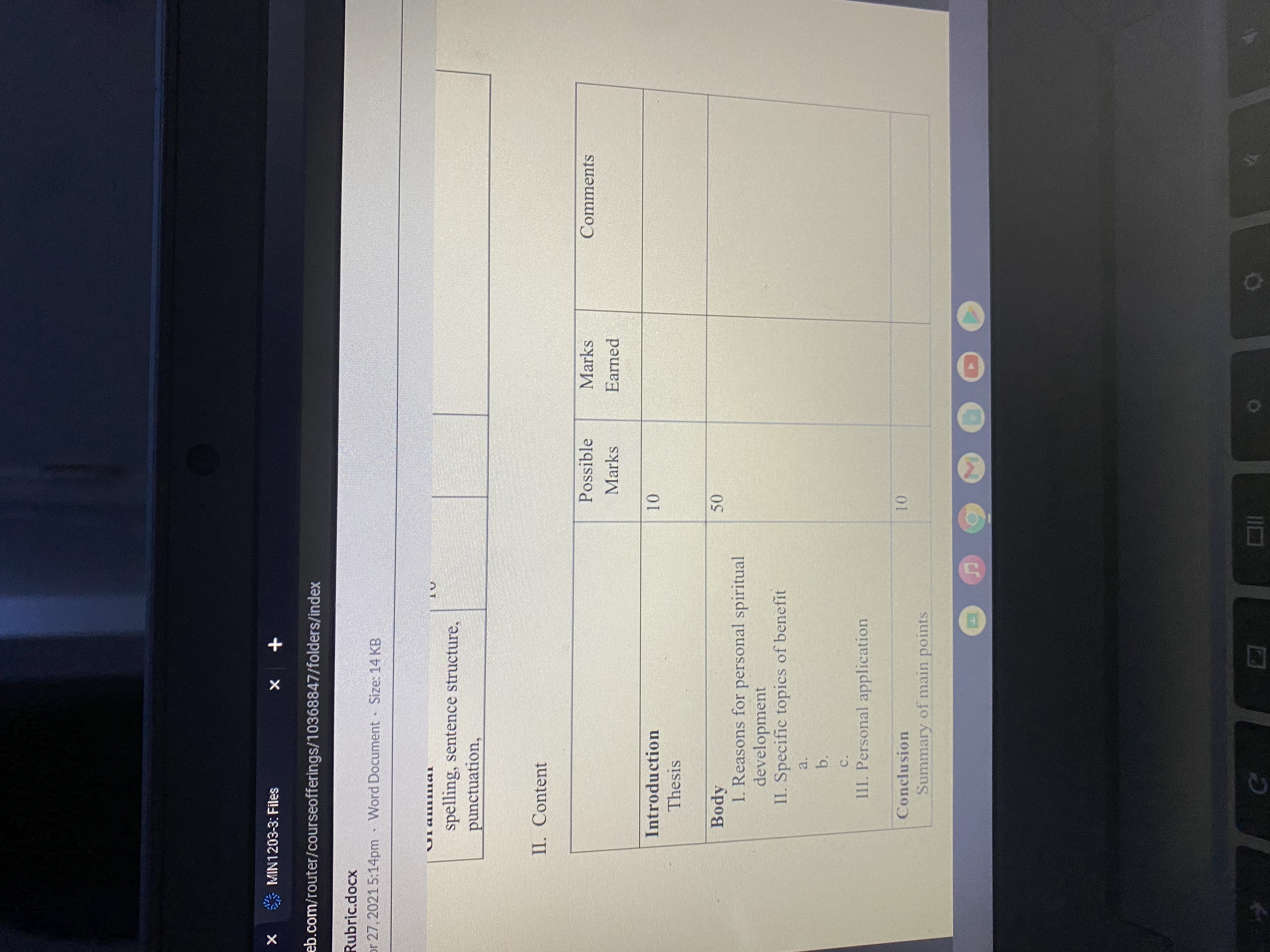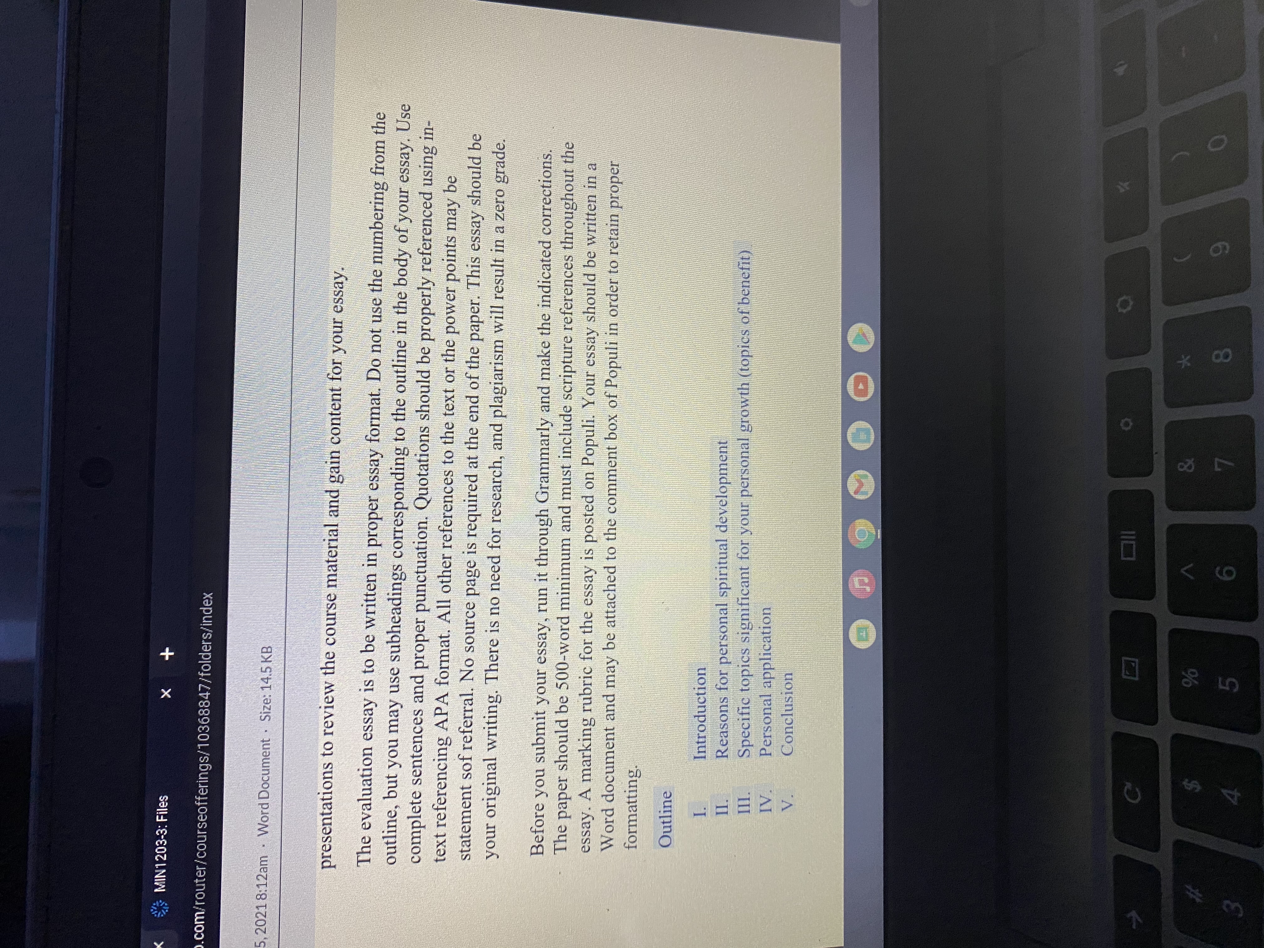 This final evaluation paper will give you opportunity to bring together what you have learned during the semester. An outline for the paper is given below. Please follow it. The marking rubric is based on the outline. Following the outline is a list of topics discussed during the semester (listed by chapter headings from the textbook) to help refresh your memory and give you some guidance. You are not expected to discuss or summarize each of the topics. Choose three topics to develop in part III of the essay. Please use your book and both power point presentations to review the course material and gain content for your essay. The evaluation essay is to be written in proper essay format. Do not use the numbering from the outline, but you may use subheadings corresponding to the outline in the body of your essay. Use complete sentences and proper punctuation. Quotations should be properly referenced using text referencing APA format. All other references to the text or the power point