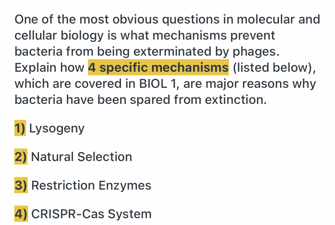 Explain how 4 specific mechanisms (listed below) are major reasons why bacteria have been spared from extinction. 1) Lysogeny 2) Natural Selection 3) Restriction Enzymes 4) CRISPR-Cas System