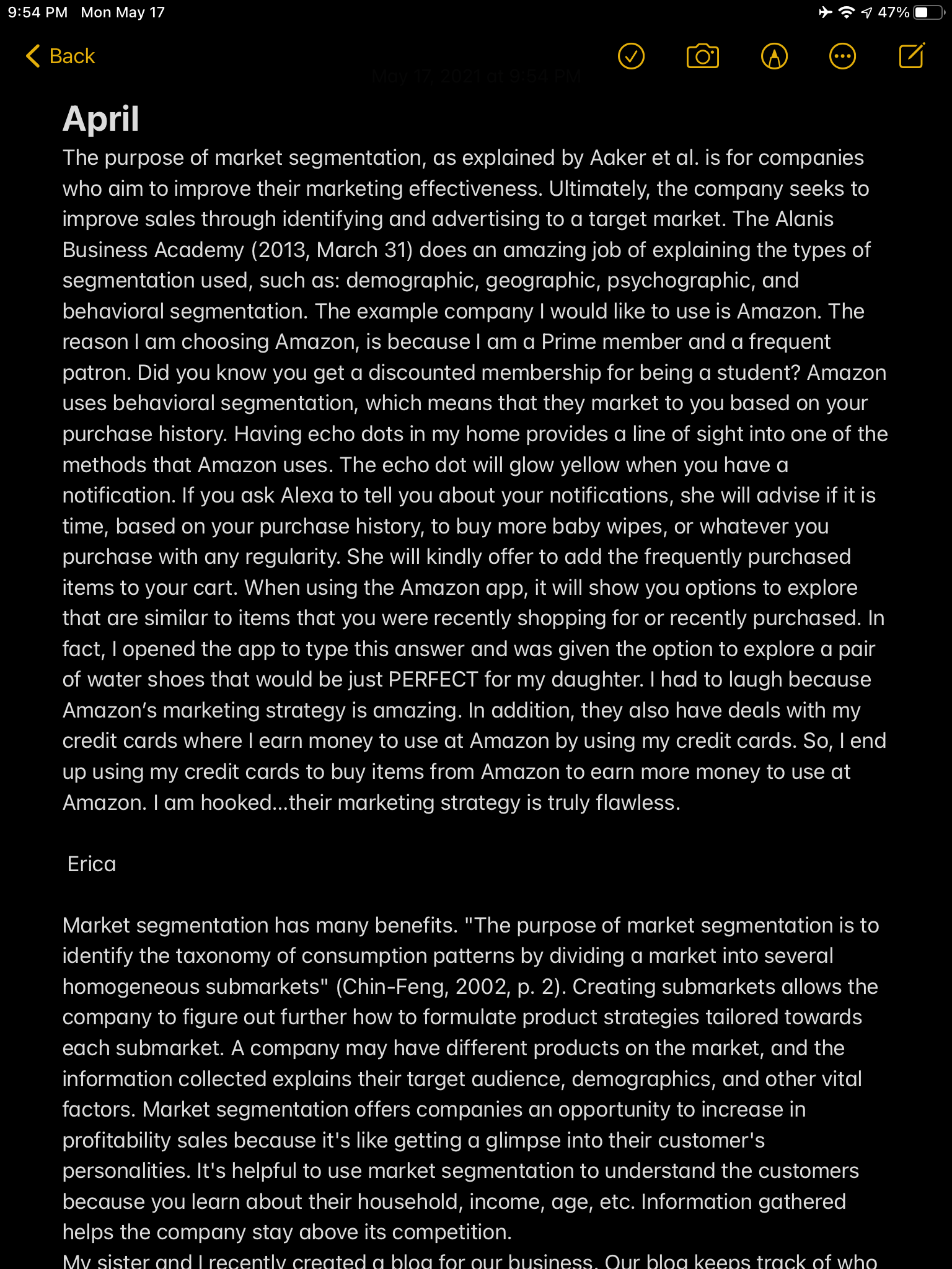 Segmentation What is the purpose of market segmentation with regard to marketing strategy? Include one example of market segmentation that is used by your company or a selected company and critique its effectiveness. Post should be at least 300 words. Respond to at least two of your classmates’ postings by Day 7.