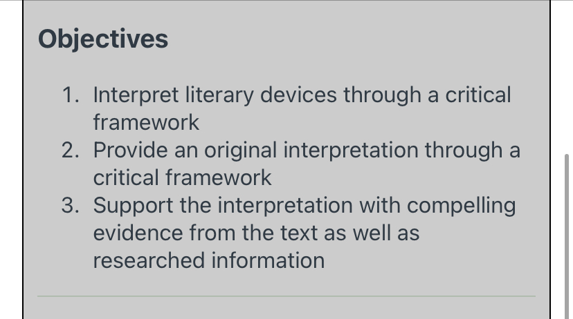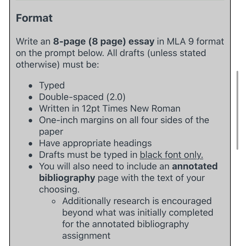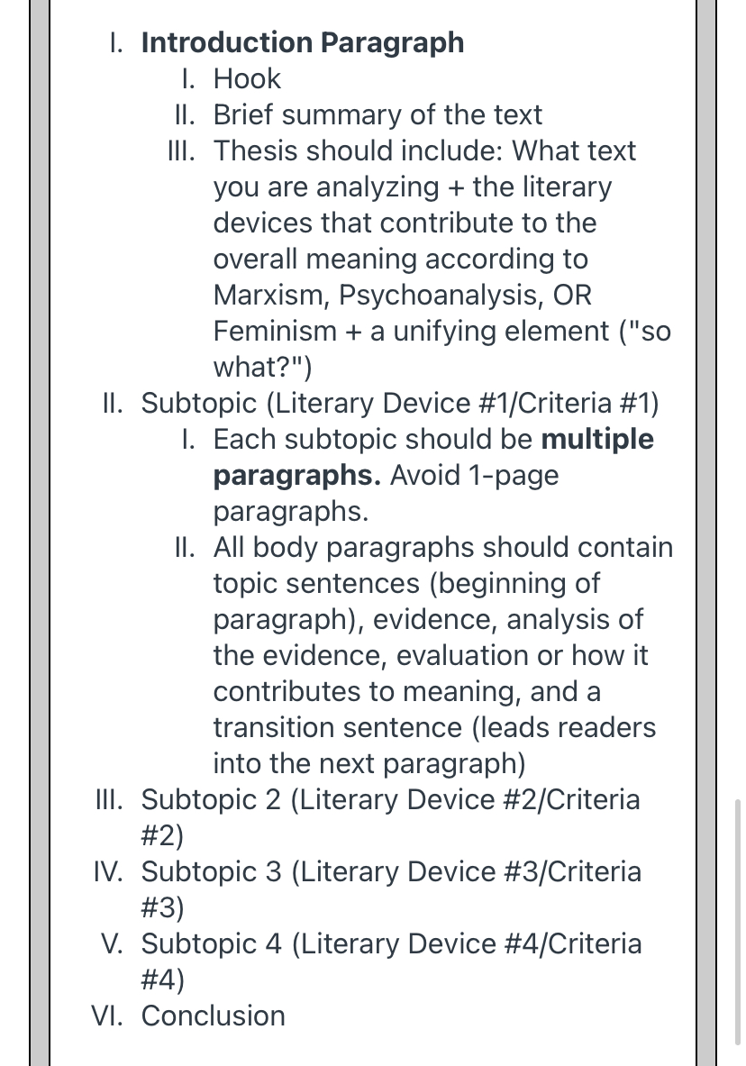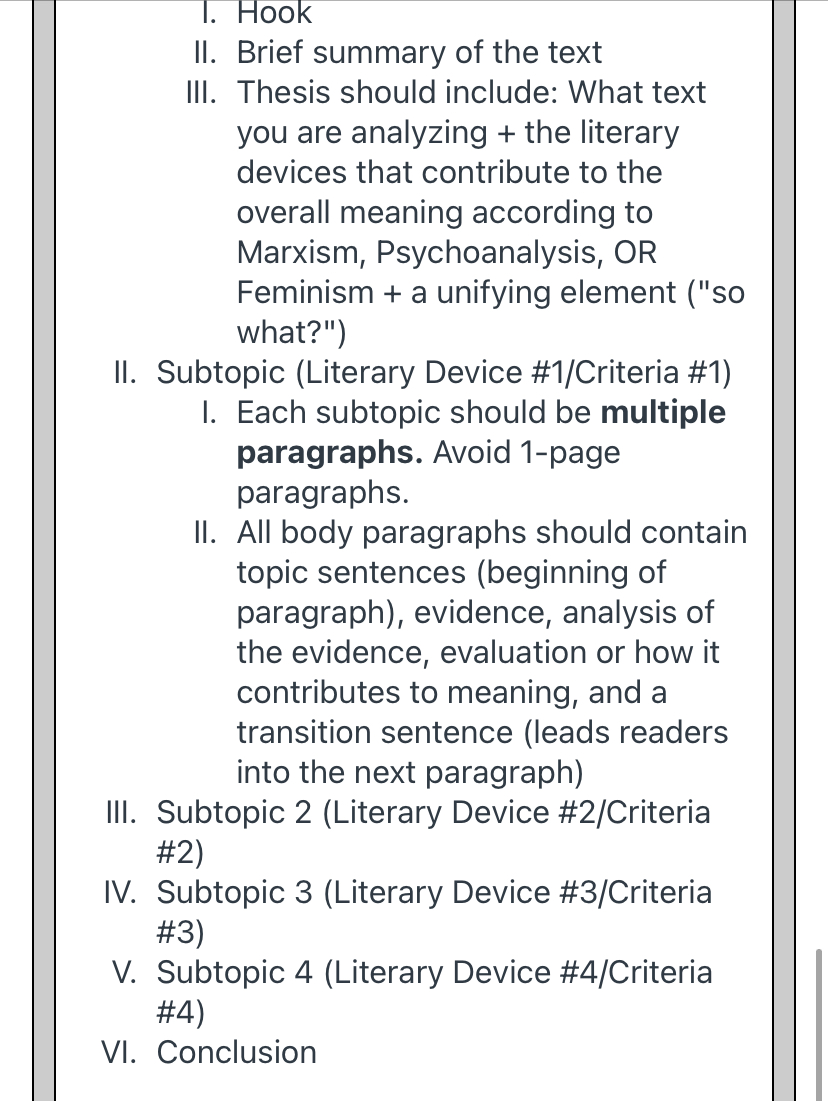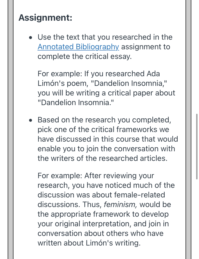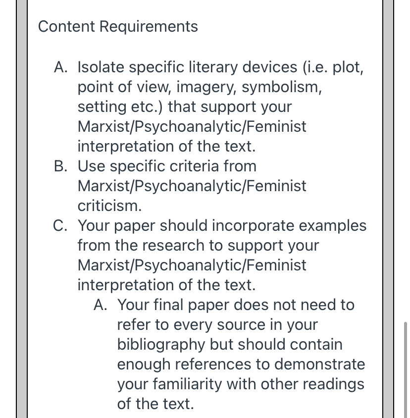 InstructionObjectives Interpret literary devices through a critical framework Provide an original interpretation through a critical framework Support the interpretation with compelling evidence from the text as well as researched information Format Write an 8-page (8 page) essay in MLA 9 format on the prompt below. All drafts (unless stated otherwise) must be: Typed Double-spaced (2.0) Written in 12pt Times New Roman One-inch margins on all four sides of the paper Have appropriate headings Drafts must be typed in black font only. You will also need to include an annotated bibliography page with the text of your choosing. Additionally research is encouraged beyond what was initially completed for the annotated bibliography assignment Assignment: Use the text that you researched in the Annotated Bibliography assignment to complete the critical essay. For example: If you researched Ada Limón's poem, "Dandelion Insomnia," you will be writing a critical paper about "Dandelion Insomnia." Based on the research you completed, pick one of the critical frameworks we have discussed in this course that would enable you to join the conversation with the writers of the researched articles. For example: After reviewing your research, you have noticed much of the discussion was about female-related discussions. Thus, feminism, would be the appropriate framework to develop your original interpretation, and join in conversation about others who have written about Limón's writing. Content Requirements Isolate specific literary devices (i.e. plot, point of view, imagery, symbolism, setting etc.) that support your Marxist/Psychoanalytic/Feminist interpretation of the text. Use specific criteria from Marxist/Psychoanalytic/Feminist criticism. Your paper should incorporate examples from the research to support your Marxist/Psychoanalytic/Feminist interpretation of the text. Your final paper does not need to refer to every source in your bibliography but should contain enough references to demonstrate your familiarity with other readings of the text. Sample Outline You can organize the subtopics of your essay by literary devices, or you can organize your subtopics by specific criteria from the critical framework. Introduction Paragraph Hook Brief summary of the text Thesis should include: What text you are analyzing + the literary devices that contribute to the overall meaning according to Marxism, Psychoanalysis, OR Feminism + a unifying element ("so what?") Subtopic (Literary Device #1/Criteria #1) Each subtopic should be multiple paragraphs. Avoid 1-page paragraphs. All body paragraphs should contain topic sentences (beginning of paragraph), evidence, analysis of the evidence, evaluation or how it contributes to meaning, and a transition sentence (leads readers into the next paragraph) Subtopic 2 (Literary Device #2/Criteria #2) Subtopic 3 (Literary Device #3/Criteria #3) Subtopic 4 (Literary Device #4/Criteria #4) Conclusion