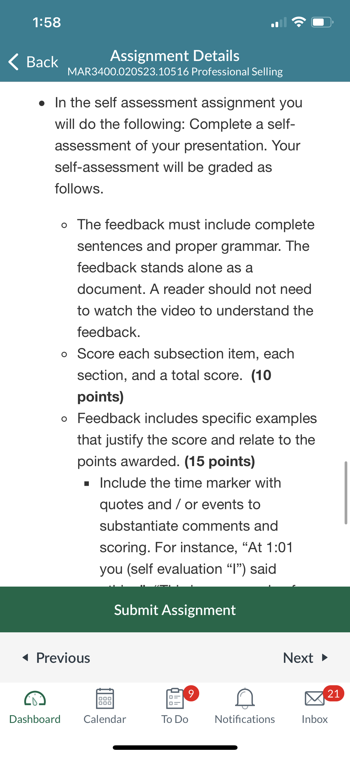 Self assessing each subsection of a template based on my 3 minutes video presentation