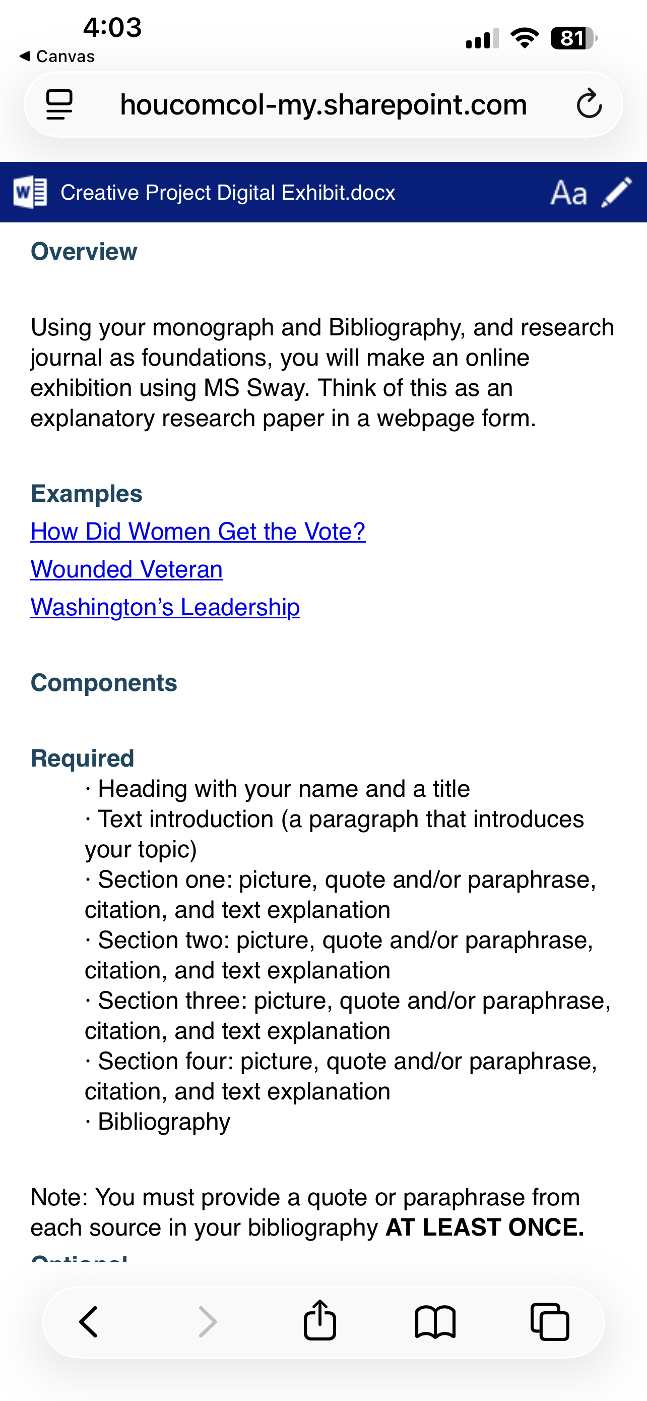 InstructionUsing your monograph and Bibliography, and research journal as foundations, you will make an online exhibition using MS Sway. Think of this as an explanatory research paper in a webpage form. Examples How Did Women Get the Vote? Wounded Veteran Washington’s Leadership Components Required · Heading with your name and a title · Text introduction (a paragraph that introduces your topic) · Section one: picture, quote and/or paraphrase, citation, and text explanation · Section two: picture, quote and/or paraphrase, citation, and text explanation · Section three: picture, quote and/or paraphrase, citation, and text explanation · Section four: picture, quote and/or paraphrase, citation, and text explanation · Bibliography Note: You must provide a quote or paraphrase from each source in your bibliography AT LEAST ONCE. Optional · Videos · More photos · More text · Links to other sites · Other (surprise me!) 2 / 2 Software Use Microsoft Sway You have free, premium access to this as an HCC student when logging in with your HCC credentials. If, for some reason, you can’t access Sway, you can use Canva or another webpage creator. Tutorial: Create a webpage using Sway Note: You are creating a webpage, not a slide deck presentation or infographic or other form.