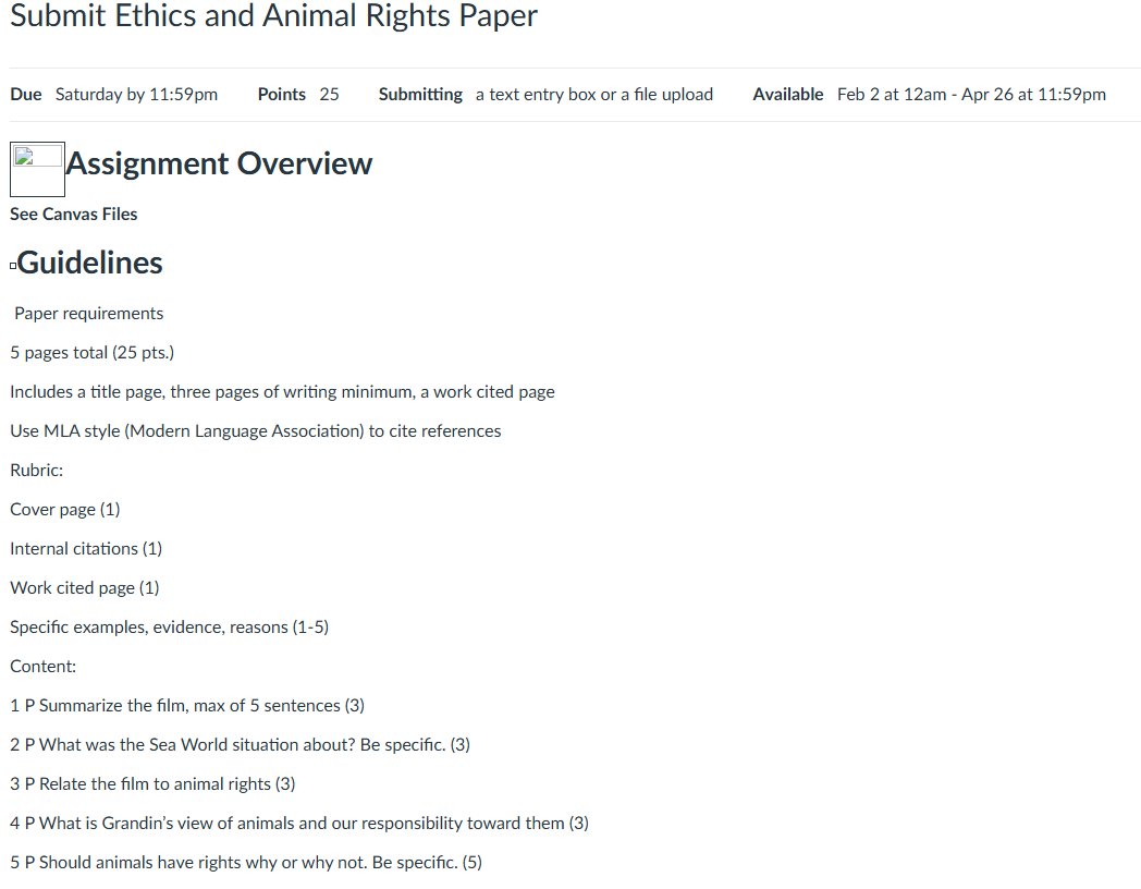 InstructionPlease review the instructions in the Dropbox for PHI2010-2263-5780. This assignment must be completed today, February 28, 2026, by 6:00 PM. The assignment requires responses to the following prompts: Summarize the film in a maximum of five sentences. (2 points) Explain the SeaWorld situation in detail. Be specific and incorporate information from the Zaveri article. (2 points) Discuss how Blackfish relates to ethics and animal rights. (2 points) Explain Temple Grandin’s perspective on animals, including their emotions and behavior, and describe our responsibility toward them. (2 points) State whether animals should have rights and support your position with specific reasoning. (4 points) Please ensure that all responses are clear, well-developed, and supported with specific examples where appropriate.