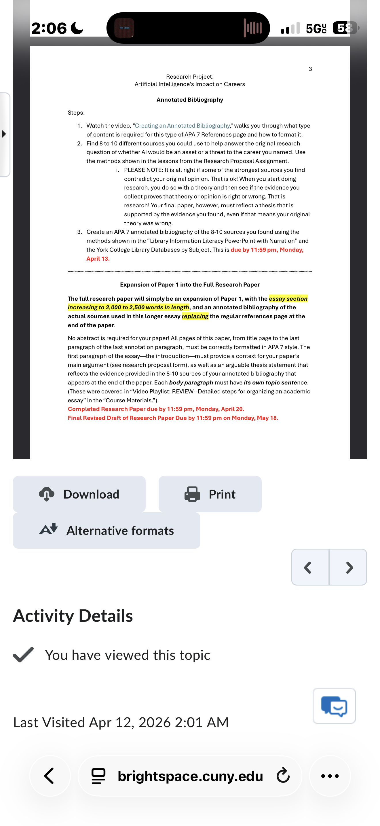 Watch the video, " Creating an Annotated Bibliography ," walks you through what type of content is required for this type of APA 7 References page and how to format it. 2. Find 8 to 10 different sources you could use to help answer the original research question of whether AI would be an asset or a threat to the career you named. Use the methods shown in the lessons from the Research Proposal Assignment.